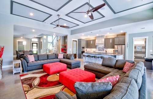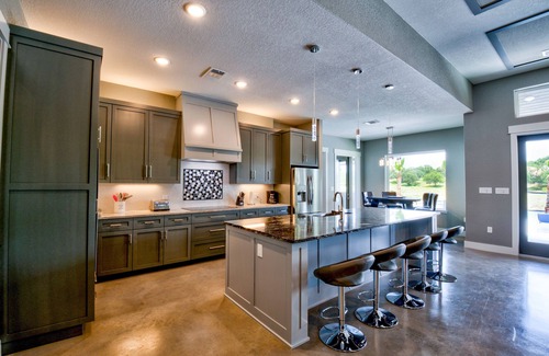 Extra-large entry area opens to the dining room and living area with fabulous lighting. It is 55 feet from the front door to the back door with no walls to close it in, so it is perfect for the large family or group of friends to have a place to gather without that crowded feeling. Large dining table and breakfast area and island seating. Beautiful kitchen is to the side, also open to the living area. It is fully equipped with modern stainless steel wi-fi appliances, including 2 large refrigerators, oven and dishwasher, 36-inch cooktop, 2-12 cup coffee pots and one Keurig coffee pot, blender, mixer, pots and pans, dishes and silverware. There is also a large pantry and large workspace island with lots of room for several cooks at the same time.