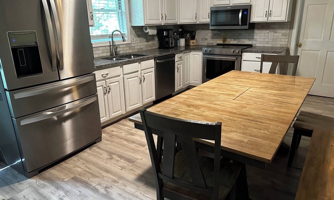 Modern plank flooring throughout the home, granite countertops, and everything on one level. The large living room boasts a large TV, wifi, and cozy couches.