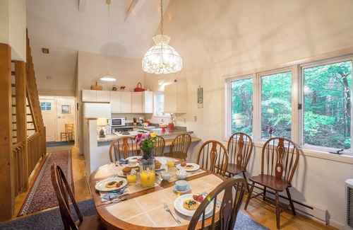 Contemporary home located in the resort of Waterville Estates. Cathedral ceiling, hardwood floors, sliding glass doors to deck. The home is located on a private wooded acre. Three bedrooms plus loft set up as two queens, two twins and a full size futon. Bright and sunny open concept with fireplace. Two full baths. Private outdoor four person hot tub. Walking distance (1/4 mile) to multi-million dollar sports center.