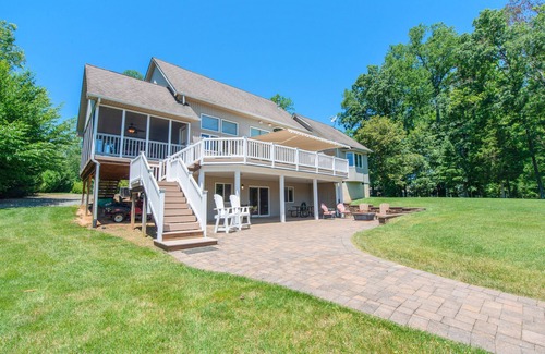 Plenty of outdoor space: screened-in porch with full dining set, a large deck with full dining set and large 2-zone gas grill overlooks the patio; remote-controlled sunsetter awning, lower level patio with covered area & outdoor firepit - perfect for roasting s'mores, and the front porch lounge to enjoy perfect sunsets.