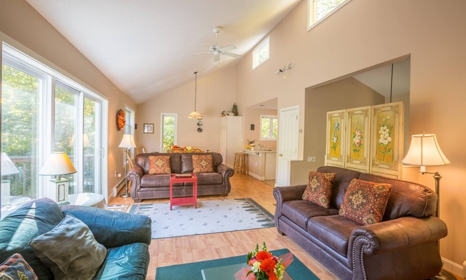 Situated in the resort community of Waterville Estates in Waterville Valley, our home is truly a retreat from the world. Upstairs you'll find an open-concept design with cathedral ceilings and plenty of light. The spacious living area features a dining table, a big-screen TV, plush couches, and a fully equipped kitchen. The woods are visible from almost every angle, and a sliding glass door opens onto a private deck. You can savor your morning coffee from there while looking out into the trees. We also offer free Wi-Fi so you can stay connected.