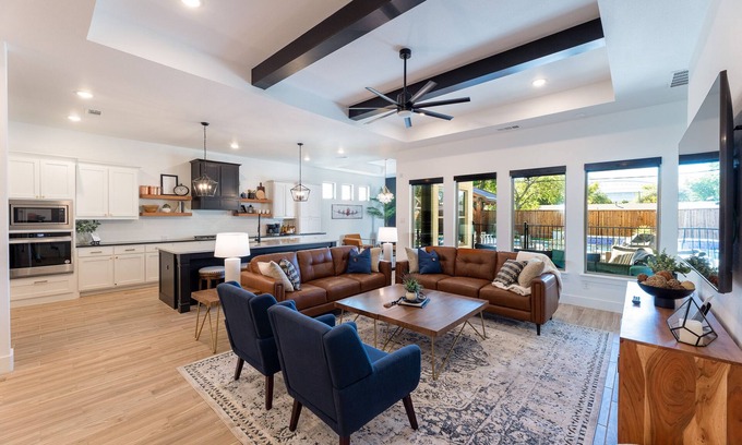 The Arlington Hero House is perfect for families, couples, groups and business travelers that desire luxury accommodations in a prime location. With its chef’s kitchen, living and dining rooms, coffee bar, game room, resort style backyard, swimming pool, spa and six spacious bedrooms, five full baths, the Hero House has everything you will need for an enjoyable stay. Best location for all stadium events.