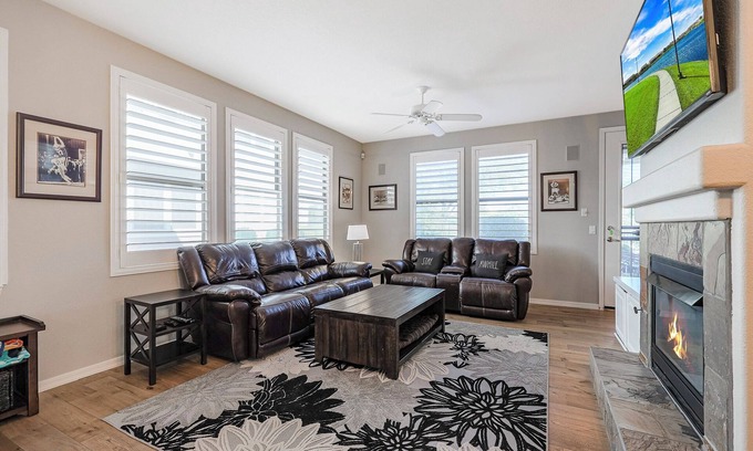 Open floorplan with a fully-equipped kitchen that overlooks the dining room, living room, and back patio. The hallway off of the living room leads to the guest bedroom on the left, guest bathroom on the right, and the master suite at the end. Master suite has an oversized, dual-vanity bathroom with separate tub and walk-in shower areas and a walk-in closet. Both bedrooms are equipped with flatscreen smart TVs. The living room seats 5-6 adults comfortably with a gas fireplace and smart TV.