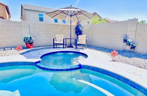 Beautiful & spacious vacation home located in one of the best areas in AZ; only minutes away from i17 & loop 101 freeway, several hiking trails, shopping centers, and Scottsdale/Anthem. The Large backyard has a sparkling pool, luxurious spa, propane grill, outdoor lounge furniture, patio seating, additional dining table, pool floats/toys, and yard games. Both adult size & kid floats available. There is a pool heating fee if you want the pool heated during your stay. Enjoy the amazing weather & peace of living in a quiet environment. Solar String lights surrounding the backyard. Friendly family neighborhood, perfect for those who are looking for a getaway experience.