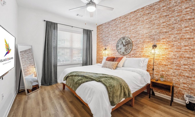 •King platform bed backed by a realistic brick wallpapered elegance.
