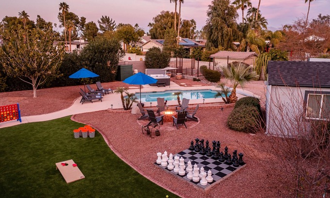 Welcome to Scottsdale Thunderbird Hideaway, the perfect getaway for families, friends, and large groups! This one-of-a-kind property features a spacious main house, a separate Casita, and a fully equipped "Game House," all nestled on nearly an acre of land packed with fun amenities. Whether you're seeking relaxation or entertainment, this serene retreat offers something for everyone.