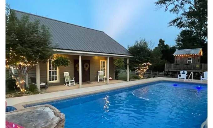 Poolhouse with saltwater pool, patio, outdoor wood burning fireplace. Treehouse and propane patio table for cozy evenings. Outside propane grill, inside the fully equipped kitchen, private master bedroom. Spiral staircase up to loft bedroom. Separate 3rd bedroom with bunk beds for kiddos. High-speed Wifi and great cell coverage.