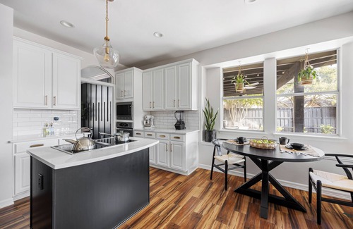 Welcome to your spacious, stylish home-away-from-home! This 3BR, 2BA single-story farmhouse retreat offers elegant finishes, private heated pool/spa, pool cabana, outdoor dining, firepit, Blackstone grill & chaise loungers. Inside features luxury bedding and spa-like en-suite bath. Kids love the cozy bunk bed & teepee room with books & board games. Centrally located in Frisco near The Star, Toyota Stadium, Legacy West, and PGA Frisco—perfect for families, couples, business, and sports travelers.