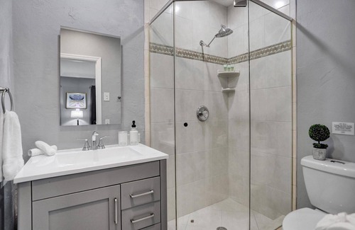 Kitchen-plenty of counter space and ample cabinetry. Stainless steel appliances. Fully stocked with basic dishware, cookware, pots/pans, and cutlery. We also provide coffee, creamer, sugar and spices.