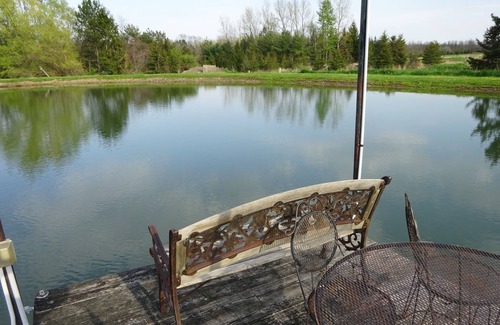 Great place for leaf peepers! Finished apartment with deck above Christmas Tree Storage building. Separate entrance with one set of stairs. Country setting with superb views, ponds, wooded areas and excellent wildlife viewing. Your stay includes a fire pit for your use and covered gazebo with picnic table. Decks extending over ponds are available for swimming, fishing and feeding fish. Licensed fishing preserve- no license required. Numerous ponds and wetlands to enjoy. Hiking and birding trails available on 150 private acres. Many additional miles on adjacent state forest including pristine Hemlock and Canadice Lakes. Guests have use of canoe, paddle boat and kayaks on large private ponds.