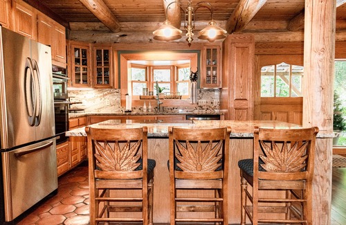 The fully equipped kitchen includes double ovens, a warming drawer, a full-size refrigerator, a dishwasher, and all the utensils needed to make any meal: a Keurig pod/drip coffee maker, toaster, blender, crock-pot, pots and pans, and a 10-piece place setting. There is a spacious island with bar seating for three and a dining area that accommodates ten.