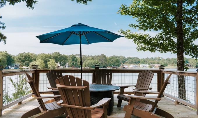 An additional deck, overlooking the boat dock, features Adirondack chairs and a gas fire pit