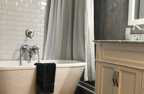 Inside the home, there is a king bed in the 1st main floor bedroom, another king bedroom, a queen bed, and 2 twin beds in 3 bedrooms upstairs. The first master, appropriately named Sunset, is located downstairs, with three walls of windows opening to a beautiful panoramic view of the pond and mountainside. Also downstairs is a full bath, which boasts a free-standing tub for stand-up showering or soaking. Up the old-fashioned classic farmhouse style staircase, you will find the Staghorn. This room offers two antique twin beds. Across the small landing is bedroom number 3, Virginia. The Virginia is located at the back of the house with a view of the wooded acres behind the home with a queen-sized bed. Across the way, you'll find the other master bedroom, the Bird’s Nest. This master has views to die for much like the other with its walk-out balcony that overlooks the pond and treetops of Hocking Hills.