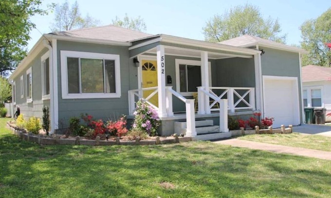 Downtown Rogers, host lives nearby and is available. This is a 1940s post-war 1 level home that has been restored and decorated for the time period. It has 2 bedrooms, 1 bath, kitchen, dining and living rooms. Small Single garage for storage only, other parking available. Close to Beaver Lake, Lake Atalanta, bike trails, restaurants, museums, and shopping. Fenced yard w/ private outdoor space. If the space is not available for the dates needed please take a look at my other listings.