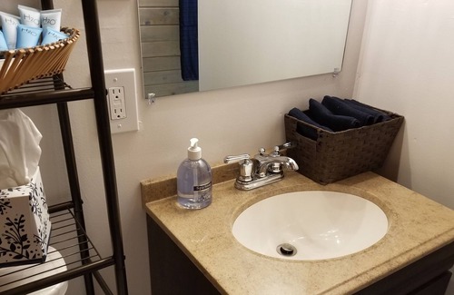 The spacious bathroom has an oversized shower and a clothes dryer that really comes in handy.