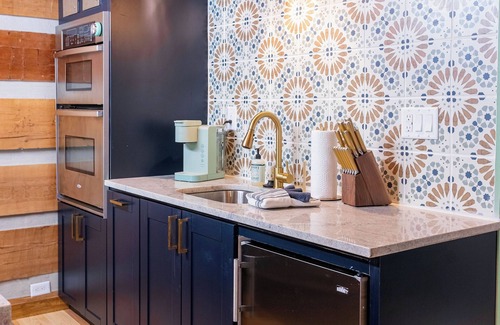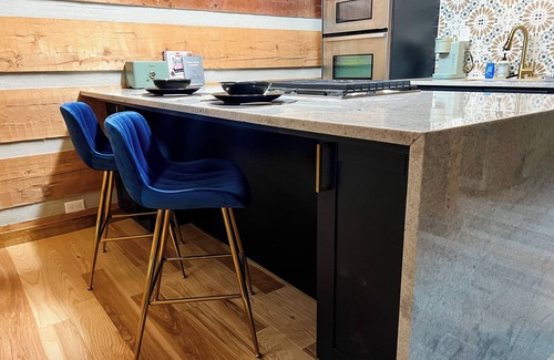 This space opens to the Kitchen with counter-height bar seating and a "tiny house living" concept. There is a mini fridge and freezer, gas stovetop, oven, microwave, and a wine cooler. The cabinets are stocked with pots, pans, cooking utensils, and basic kitchenware. You will also have a Keurig single-cup coffee maker and a toaster.