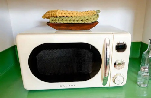 Corky is what I would describe the 70s themed kitchen. There is a floor to ceiling wood paneled cabinet original to the home that holds all of the kitchen accessories. Appliances including a fridge, freezer, stove, oven, blender, pots/pans, knife set, Insta pot, blender, dishwasher, etc. to cook any home cooked meal. With bright green colored cabinets and a pastel sink, let me know what comes to your mind when you get to cookin’!