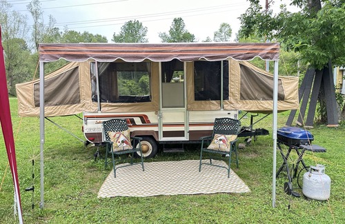 Retro Pop-Up Camper on Ischua Creek @ Campground Adventures | RV Rental in Hinsdale