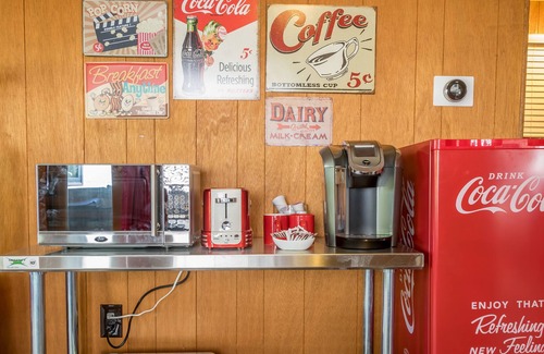 Retro studio cabin on beautiful lakefront property! This self-contained miniature home is perfect for the business traveler or couples on getaway.