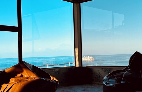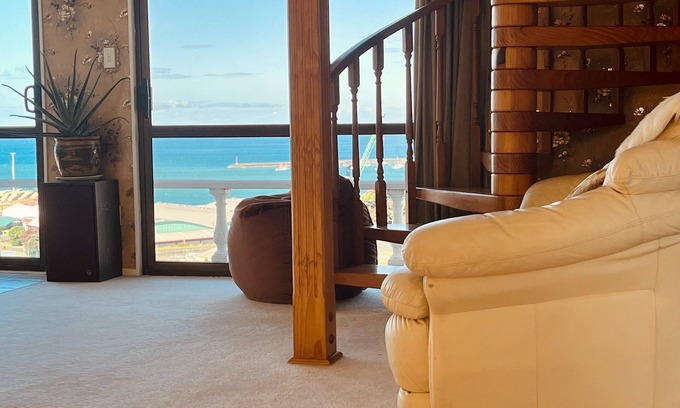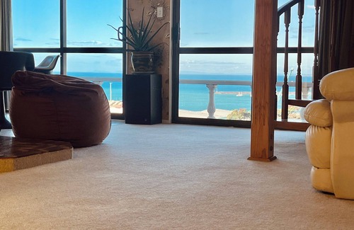 Retro house with endless views. Two floors, with two bedrooms and a bathroom on each, connected by a spiral staircase. Vistas over the port and up the coast from both living areas, and two of the bedrooms. A short drive to the city centre and local beaches.