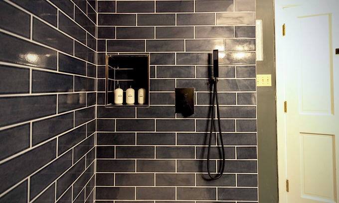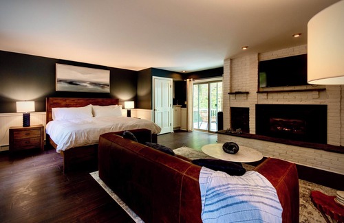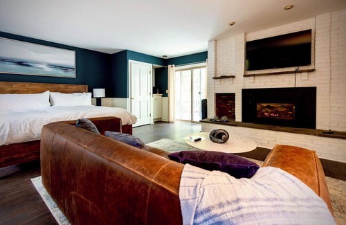 The Chateau Suite is an exquisite retreat designed for those seeking a blend of classic elegance and modern comfort, set against the tranquil backdrop of the Hudson Valley. Upon entering, you are greeted by a spacious living area adorned in rich grey blue tones that evoke a sense of calm and sophistication. The centerpiece of this inviting space is a leather couch, perfectly positioned around a fireplace. This cozy arrangement is ideal for relaxing evenings, whether you're enjoying a good book, a glass of wine, or simply the warm glow of the fire. One of the suite's standout features is the private deck, offering breathtaking views of the serene woods. This outdoor space is perfect for morning coffee, quiet reflection, or simply soaking in the natural beauty of Hudson Valley. The room features a luxurious king-sized bed, draped in sumptuous linens that promise a restful night's sleep. The private bathroom is a modern sanctuary, equipped with a spacious rain shower. Elegant fixtures and sleek design elements enhance the sense of luxury, providing a perfect place to refresh and rejuvenate.