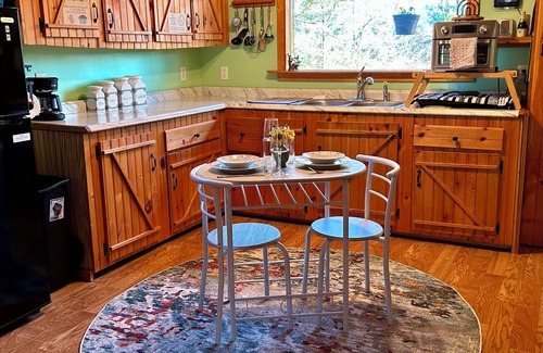 Take a seat on the porch swing and let your worries drift away. Rhoz-A-Bee’s by the Farm offers a peaceful retreat with outdoor dining under the stars and stargazing by night. The well-equipped kitchen includes a toaster oven, convection microwave, and induction cooktop—perfect for preparing meals with ease. A cozy queen bed with plush bedding and an electric blanket ensures restful nights. Need to work? A quiet, dedicated workspace is ready for you. Whether you're seeking a romantic escape or a serene place to recharge, Rhoz-A-Bee’s has everything you need for a restorative stay.