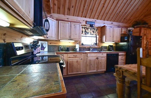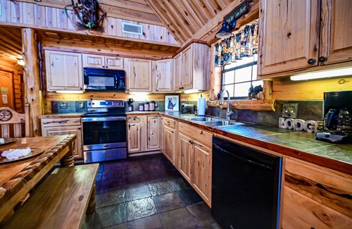 The home is appointed throughout with real log furniture and rustic design elements. Guests can spread out across three bedrooms and a large sleeping loft complete with bunk beds. Additionally, two log couches in the living area lay flat to round out sleeping arrangements. Two full bathrooms downstairs and one up provide convenient access for all.