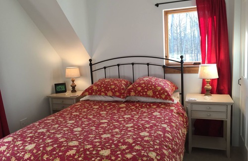 Welcome to one of the best neighborhoods in New Paltz! Close to Mohonk Preserve and Minnewaska State Park as well as New Paltz and Gardiner. We feel very lucky to offer a private, brand new 1 bedroom, 1 bath apartment that comfortably accommodates 4 on the second floor of our carriage house. The open floor plan, tall ceilings and large windows provide for a light and airy space that accommodates 4 adults comfortably. The bedroom has a queen size bed and plenty of closet space with beautiful views of the pond. There is a futon in the living room with a very comfortable queen size mattress along with a smaller closet. Guests can belly up to the bar while preparing a meal in the kitchen. The kitchen has basic spices, oils, coffee and tea. There is a small balcony off the living room to get some fresh air or sit and enjoy a drink. The balcony looks down on the blue stone patio with gas grill and fire pit. Dine al fresco on the balcony or patio. The bathroom has a washer, dryer, hair dryer and plenty of toiletries.