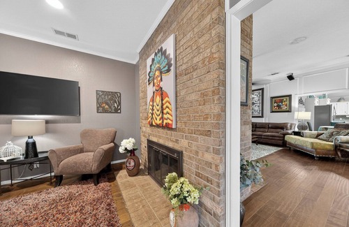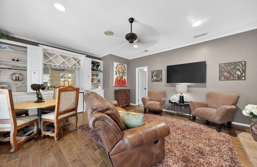 Welcome to Right at Home this house is located next door to Santiago Dreams. Rent separately or both for large groups. Inside you will find an open spacious floor plan with dining seating for 22. This house is set up for larger groups or combined families. There are two bedrooms with queen beds and two bedrooms with multiple beds. There are two living areas and a chef's kitchen fully stocked to prepare meals. Outside you will find multiple seating areas for 14. There's plenty of space so that everyone feels comfortable and three full bathrooms so guests can get ready quickly.. Come make yourself Right at Home in Midland.