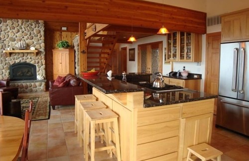 The full-equipped, modern kitchen features slab granite counter tops, a large cooking island with a raised eating bar and seating for five, and a dining room with seating for 6.