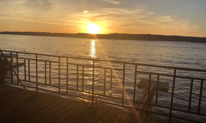 One of the best lots on Grand Lake. Views can't be beat. Create great memories enjoying this 3 bedroom, 1.5 bath house on the main lake. Enjoy the outdoors on our 2,000 square foot deck. 10 steps down from the deck and you are on the catwalk that leads to the swim dock. The master bedroom has a king sized bed, the middle bedroom has a double bed and the front bedroom has a queen sized bed. Spacious family room with huge fireplace. Enjoy indoor dining with a large table that seats 8 or enjoy outdoor dining with multiple seating areas. Has Wi-Fi and Cable. Get ready for one of the best times of your life!