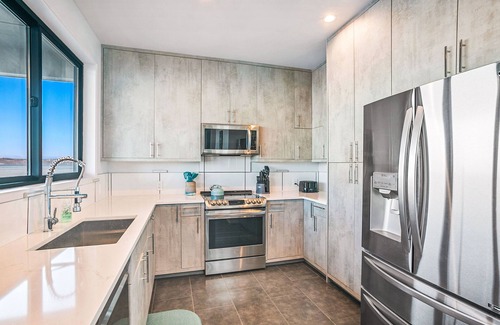 The open concept living/dining/kitchen has plush couches and chairs, dining table and chairs and a large kitchen with plenty of room to let your inner chef explore any culinary delight you might imagine. There is a suite of new appliances and plenty of cookware, dinnerware, flatware and utensils to accommodate your group.