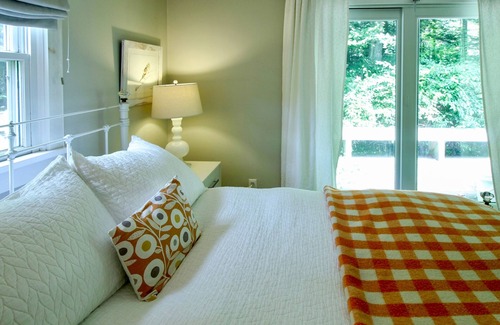 River Cottage is a sweet getaway with bright, cheerful décor, set on a quiet dead end lane. The house has an “L” shaped deck that looks out into the pretty woods out back, and out over the landscaped side patio and lawn beyond. Just past the fire pit in the woods, the tumbling headwaters of the Neversink River is both a visually beautiful spot, but also provides a calming sound that with summertime windows open lulls you to sleep.