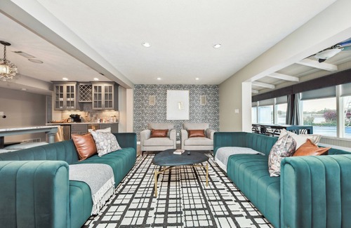 - Dining space: Kitchen island with stools for 7, long formal dining room with seating for 12.