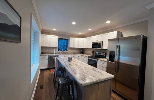 There are 3 bedrooms and a bonus/game room with enough beds to accommodate up to 10 guests. The first floor bedroom features an ensuite and king size bed. The second floor boasts two large bedrooms, one which is ensuite with a king size bed and twin sleeper sofa and the other with a double bed and twin bed. There are 3.5 bathrooms in the home, a large fully equipped kitchen and game room with Foosball, Air Hockey, Giant Connect Four and Scrabble for hours of entertainment. When you are ready for some fresh air, head out back and directly down to the river for some fishing or river tubing.