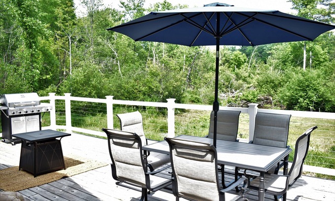 Located downtown Baldwin, this property feels like you are miles from down. It's on a 3 acre wooded lot, with a creek and the Baldwin River in the backyard. The large deck contains a dining table for 6, a gas fire table, a grill and plenty of seating to enjoy the outdoors. Baldwin is great for any outdoor enthusiast, with ample river access to one of the best trout streams in Michigan, plenty of ORV trails, and centrally located to explore all the area has to offer.