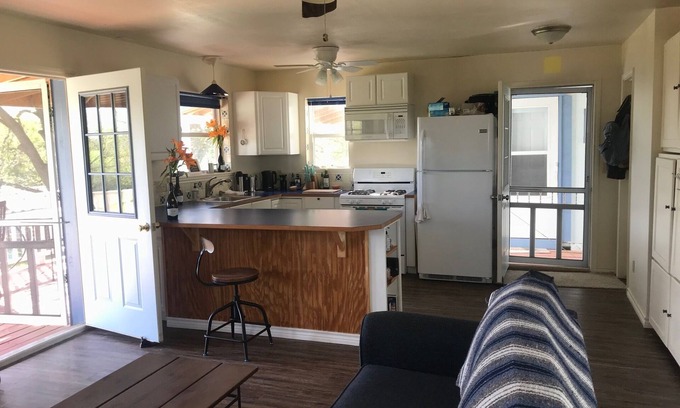 ~134' of Colorado River Frontage. 3 decks to take in the views, enjoy the sunrise and watch the wildlife. Walk out to the dock for fishing, kayaking or just sit and enjoy in peace. Open living space to the kitchen with all you expect to have in a kitchen (sans your groceries) with 2 bar charis. Plenty of natural light and 3 doors for a nice cross breeze on a beautiful day. In the Living room there is blue couch which is a pull-out queen mattress, a 2 seater couch and arm chair with TV. Upstairs you will find a large bedroom with 2 queen beds with very comfortable mattresses. There is also a back deck to give you a bit more perspective and view of the Colorado River. Bathroom has a double vanity with bathtub and all soaps. San Saba, Llano and Lampasas are all roughly a 20-30 min drive. Tons of places to explore within those cities that I would be happy to tell you more - Wineries, Shopping, Exploration, Food and more. Don't forget to checkout the Bend General Store, a short 5 minute drive where you'll find live music, good food and great people. Let Bret know I sent y'all!