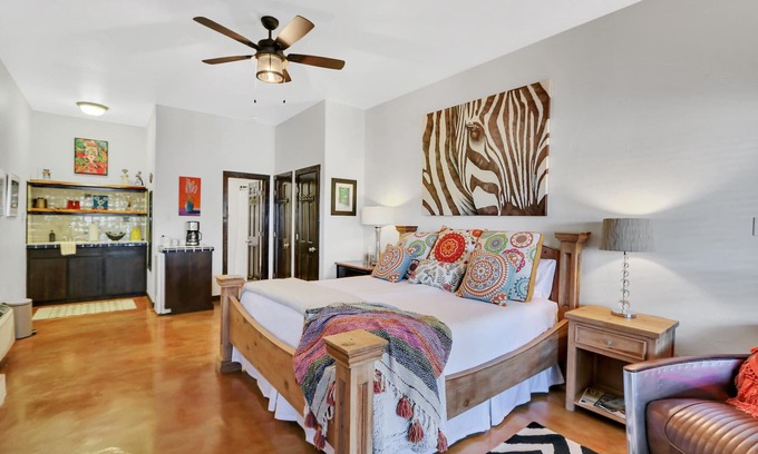 With stunning views overlooking the tranquil banks of the river the Llano Suite offers luxury, comfort, and its own artistic flare. Spend chilly evenings snuggled around the fireplace (only duraflame logs are allowed to be burned) watching a favorite movie on the flat screen television. The suite offers a coffee bar to include a coffee maker, mini fridge, and sink. A private covered porch area with seating overlooking the river is just the place to enjoy a morning cup of coffee. Sleep soundly on the king bed dressed in luxurious linens surrounded by creative, colorful art inspired by nature. Tidy up for a night on the town in the full bath with a stand alone shower.