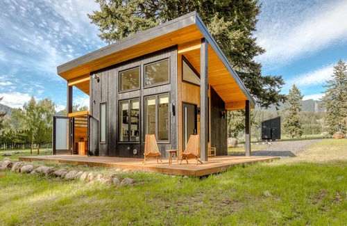 Another 600 square feet of living space await outside, including a wrap-around deck, an outdoor shower with a Japanese-style sit-down feature, and an open-air infinity tub with pure geothermal spring water sourced from 3,000 feet below the Wind River. WiFi, an electric vehicle charger, and a mini-split air conditioner are on hand as well. The indoor bathroom shower has a built-in steam sauna.