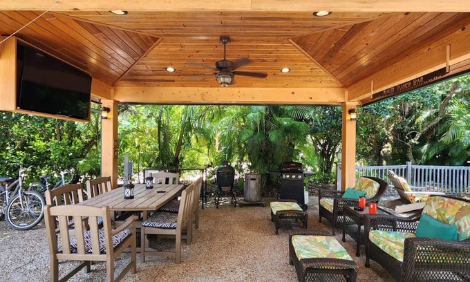 Rain or Shine, you can Camp in Class & Comfort on our spacious, very private and shaded RV LOT at the gorgeous River Ranch RV Resort! This privately owned RV campsite is FULL HOOKUP and offers 30/50amp service, water, sewer and cable hookups. This Lot has a GORGEOUS custom pavilion with TV, nice comfy furnishings, a cozy firepit area, multiple seating areas, bicycles for you to use, a grill, green egg and prep table! Bring your RV this rental is for the LOT only.