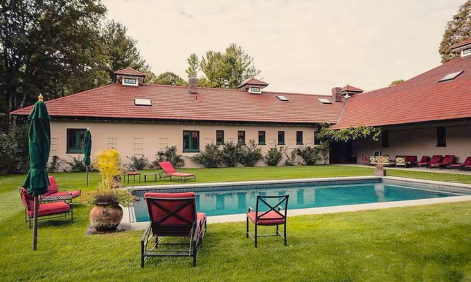 River Road Farm is the ultimate Vermont getaway! Just minutes from downtown Manchester, our exclusive retreat offers a heated in-ground pool (seasonal) and a one-of-a-kind lodge inside a stunning Mediterranean-style barn. Relax in the spacious living room with a 75” Smart TV, cook in the fully-stocked kitchen, and gather in the rustic dining room with large copper table. Accommodations include a luxurious king master suite, as well as two additional rooms with king beds, and an incredible bunk room with eight twin and four queen beds. Amenities include high-speed fiber optic internet, smart tv's in every bedroom, gas grill, plenty of furniture both inside and outside, and 18+ acres of grounds including a private pond. With four full baths and a half-bath, everyone has plenty of space to refresh before the day's adventures!