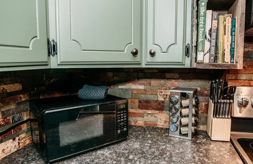On cooler evenings, the living room's pellet stove adds warmth and ambiance, allowing you to relax by the open flame as you gaze out at the river. Our fully stocked kitchen provides everything you need to prepare a delicious meal during your stay, whether you're cooking for a family or a larger group.