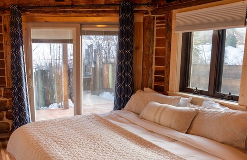 This is home sleeps 10. There are three bedrooms, a loft with two beds, and a separate cabin with a queen bed on the property.