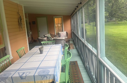 Built in 1883, this charming cottage has been updated while still retaining the original cottage feel. On the first floor you will find a bedroom with queen size bed, living room with tv, wide open kitchen/dining/relaxing room, 1 full bath with/shower as well as a 1/2 bath, washer/ dryer and access to a large screened in porch for dining, relaxing and napping. Upstairs you will find three bedrooms with a total of two queen beds, one full bed and one stacked bunk bed.