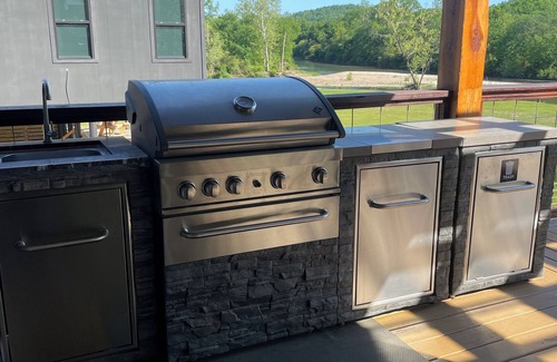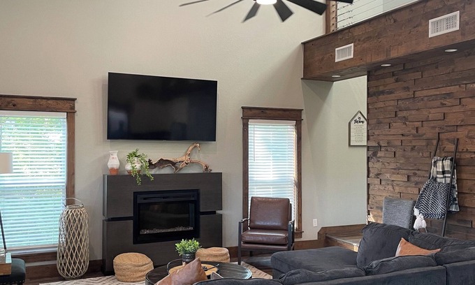 Caddo River access on-site, 2100 Sq Ft, Outdoor Kitchen, Upper and Lower Decks with comfortable seating and dining. This cabin is geared towards being child proof with gates on the indoor staircase and the upper deck.