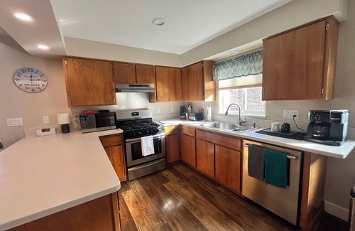 This home features a beautiful deck to sit on and watch the river and wildlife while having dinner or barbequing on the back covered dining area. The full kitchen has pots & pans, baking pans, mixing bowls, dishes, glasses, cups, coffee makers and Keurig, and many more amenities. There are some stocked items such as spices, oil, sugar, etc. The counter is comfortable to sit at or the dining table.