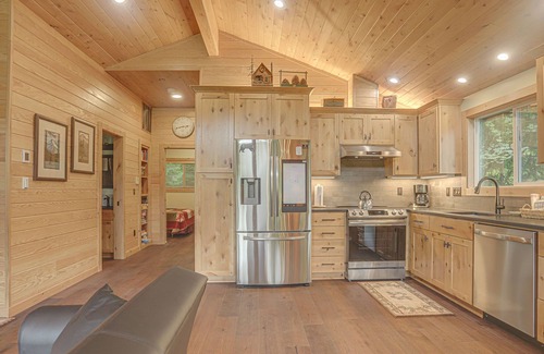 Prepare a special dinner in the newly-remodeled, fully-equipped kitchen or grill steaks on the gas BBQ. Then take a relaxing evening soak in the private hot tub surrounded by tall trees and serenaded by the sounds of the flowing Sandy River.