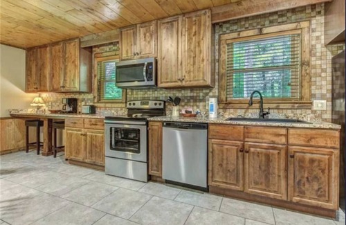The fully-equipped kitchen boasts modern amenities, making it easy to prepare delicious meals for your family or friends. Well-appointed with a full-sized refrigerator, dishwasher, stove, microwave, and other kitchen appliances perfect for making breakfast, lunch, or dinner throughout your stay! All pots, pans, glasses, plates, silverware, etc are also there for you! Gather around the inviting dining area to share stories and laughter, as it invites you to savor each bite while taking in the natural beauty of the surroundings.