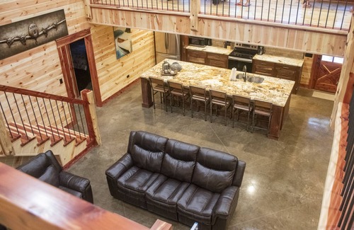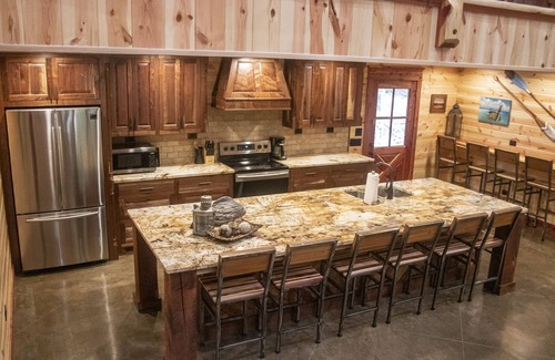 Large, open kitchen and living areas with a back porch and deck that lead right to the river. This large cabin is sure to accommodate your entire group.