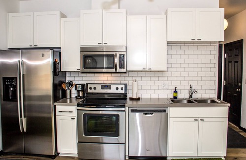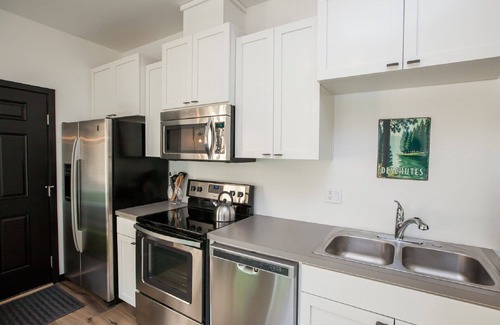 Gorgeous river views, stylish 1bdrm guest house. Right on the river trail and less than a mile to the Old Mill, amphitheater, and endless dining, shopping and entertainment opportunities. Hike, bike, kayak, paddle board, float, rock climb, fish the Deschutes all without getting in your car. Wake up in the heart of Bend and feel like you are camping in the woods on the river. Fully furnished and well equipped, lease term must be a minimum of 29 nights.